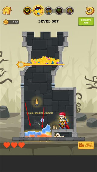 4、依據(jù)LAVA-WATER-ROCK規(guī)則,利用元素克制關(guān)系,先消除危險元素,再拔針獲取上方寶藏。