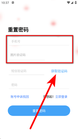 2、在重置密碼頁面,輸入手機(jī)號(hào)和對(duì)應(yīng)的圖片驗(yàn)證碼,點(diǎn)擊獲取驗(yàn)證碼。