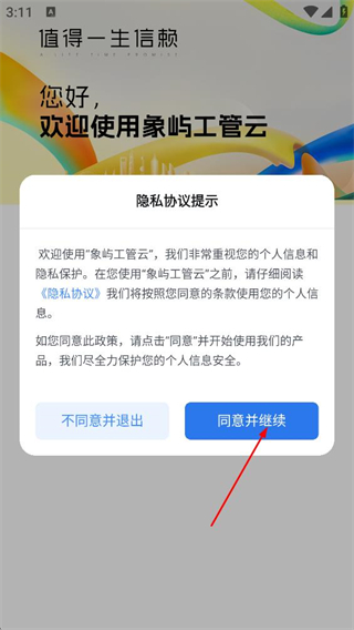 1、在象嶼工管云的隱私協(xié)議提示彈窗中,點擊同意,進入登錄頁面。