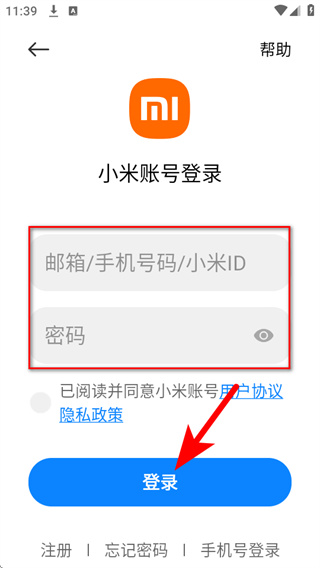 4、在登錄頁面填寫小米賬號(hào),勾選相關(guān)協(xié)議后,點(diǎn)擊登錄,即可完成登錄操作。
