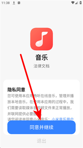 1、打開小米音樂,在彈窗中點(diǎn)擊同意并繼續(xù),進(jìn)入應(yīng)用主界面。