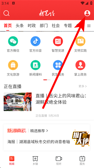 1、打開(kāi)新巴陵,點(diǎn)擊右上角的頭像圖標(biāo),進(jìn)入個(gè)人頁(yè)面。