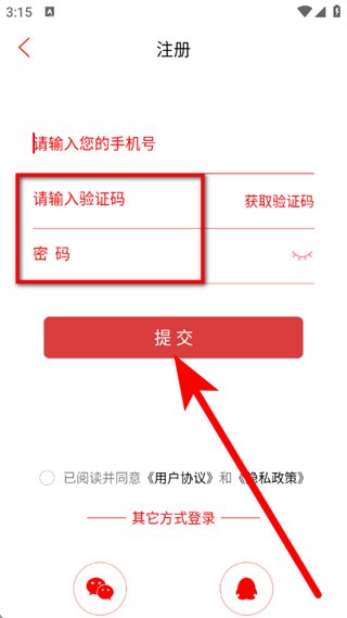 5、在注冊(cè)頁(yè)面,輸入驗(yàn)證碼、設(shè)置密碼,點(diǎn)擊提交,完成注冊(cè)。