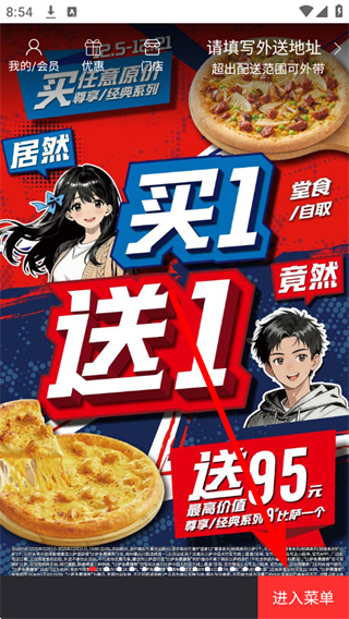 1、打開達(dá)美樂比薩,點(diǎn)擊頁面底部的進(jìn)入菜單按鈕,進(jìn)入商品選擇頁面。