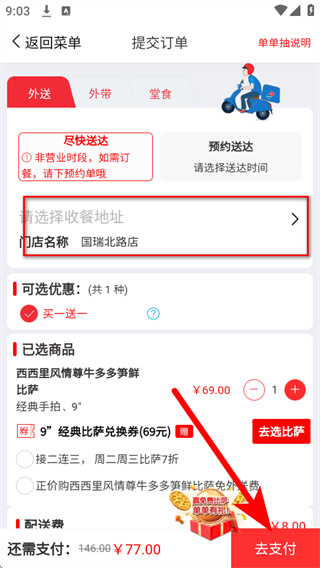 5、在地址處填寫外賣收貨信息后,點(diǎn)擊去支付完成外賣訂單的提交。