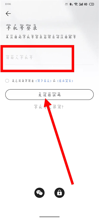 3、在登錄頁面,輸入手機(jī)號,勾選后,點(diǎn)擊發(fā)送驗證碼。