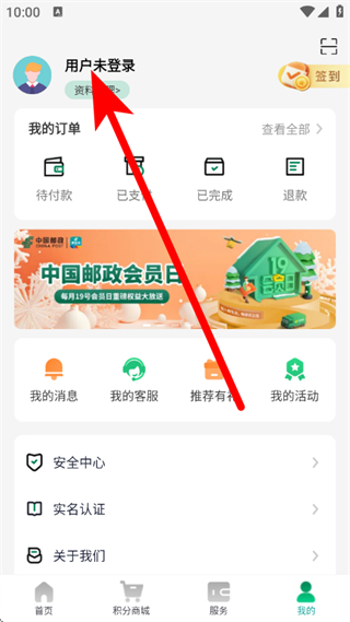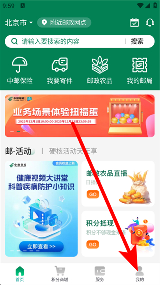 1、打開郵生活,點(diǎn)擊底部的我的,進(jìn)入我的頁面。