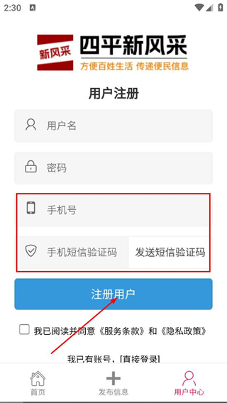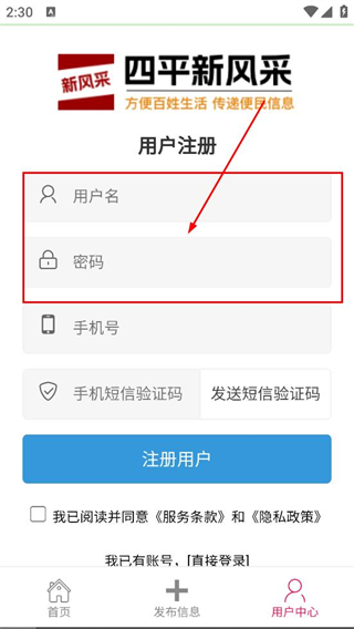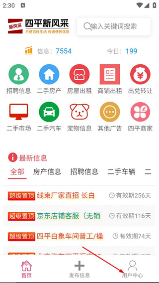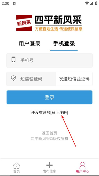 1、在四平新風采首頁,點擊底部用戶中心,進入登錄頁面。