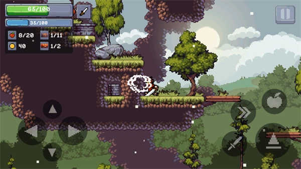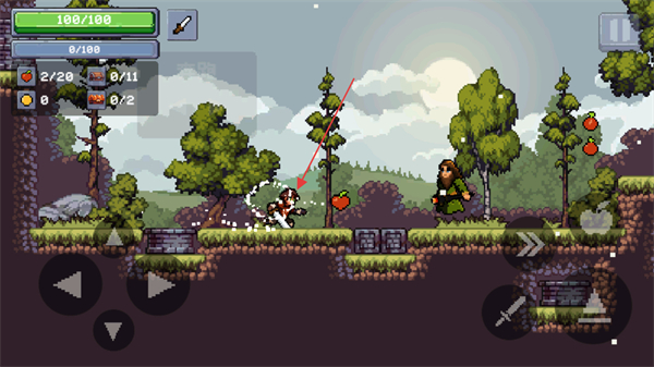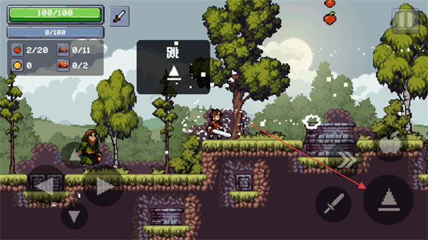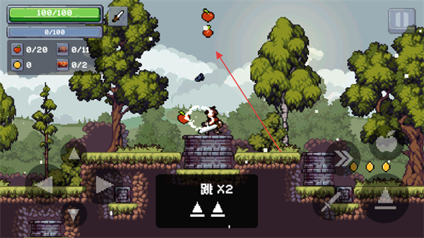 3、執(zhí)行跳×2的二段跳操作,獲取高處的蘋果道具。