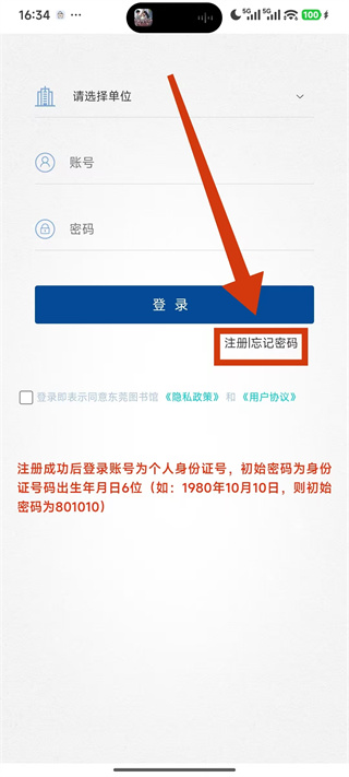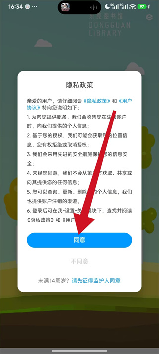 1、打開關(guān)聯(lián)東莞圖書館的應(yīng)用,在彈窗中點(diǎn)擊同意,進(jìn)入登錄頁面。
