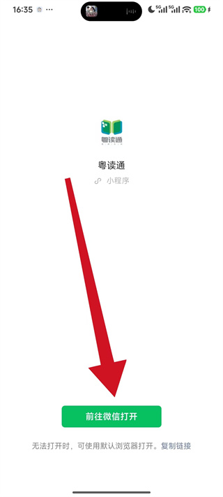 3、在跳轉(zhuǎn)頁面點(diǎn)擊前往微信打開,跳轉(zhuǎn)到微信內(nèi)的粵讀通小程序頁面。