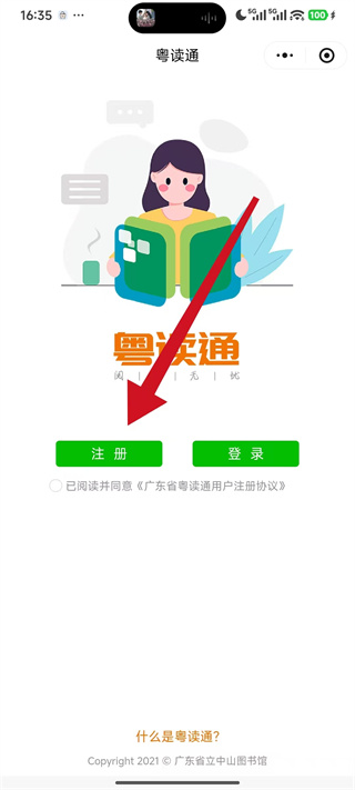 4、在粵讀通小程序頁面,勾選協(xié)議后,點(diǎn)擊注冊,按指引完成東莞圖書館賬號的注冊。
