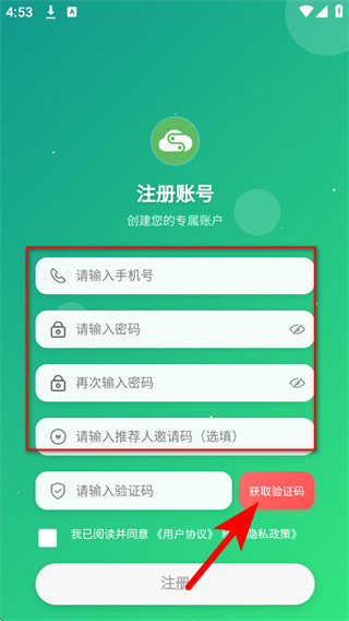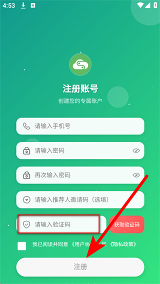 5、將收到的短信驗證碼填入勾選相關(guān)協(xié)議后,點擊注冊,完成賬號注冊。