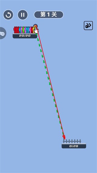3、返回主界面后選擇第1關,點擊上方人群處并按指引拖動至下方平臺,完成人員轉移。