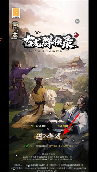 1、進(jìn)入游戲后,點(diǎn)擊箭頭指引的按鈕,這是進(jìn)入游戲主場(chǎng)景的關(guān)鍵操作,點(diǎn)擊后即可開(kāi)啟古龍群俠的冒險(xiǎn)流程。