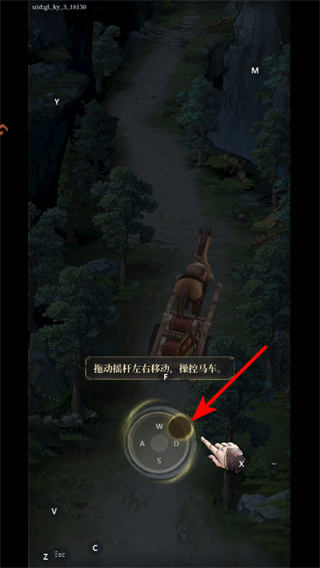 2、找到箭頭標(biāo)注的操控區(qū)域,拖動(dòng)搖桿進(jìn)行移動(dòng),這是操控馬車行進(jìn)的基礎(chǔ)操作,拖動(dòng)后可控制馬車向?qū)?yīng)方向移動(dòng)。