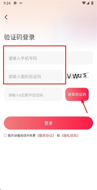 2、在手機(jī)登錄頁面填寫手機(jī)號(hào)圖片驗(yàn)證碼,勾選協(xié)議后,點(diǎn)擊獲取驗(yàn)證碼。