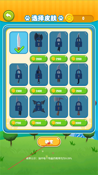 2、這是選擇皮膚界面,展示了多款刀具皮膚,需消耗對應數(shù)量金幣解鎖,選定可用皮膚后點擊確定按鈕,即可應用該皮膚進入游戲。