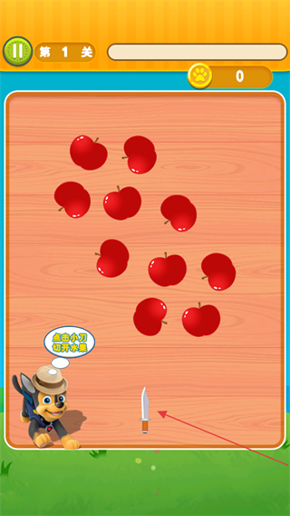 3、當前是第1關的游戲界面,界面提示點擊小刀切開水果,點擊小刀利用其切割界面中的蘋果,完成水果切割是本關卡的核心操作目標。