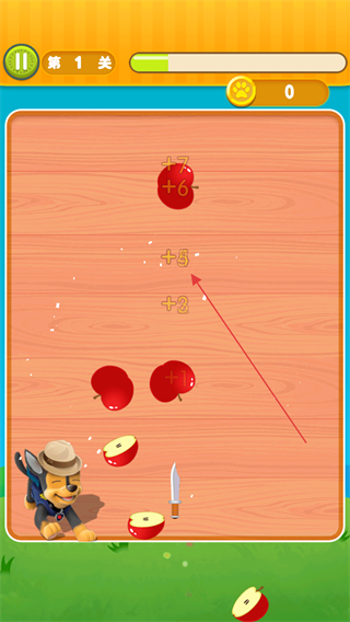 4、小刀切碎水果后會根據切割的范圍進行分數(shù)的獲取,直到上方的進度條滿后才能通關。