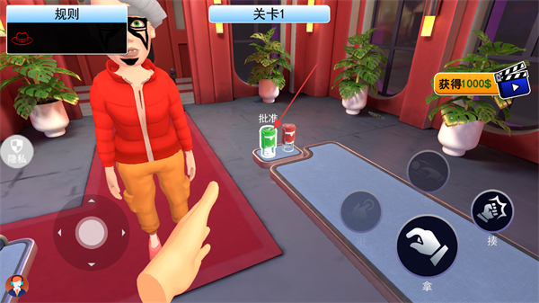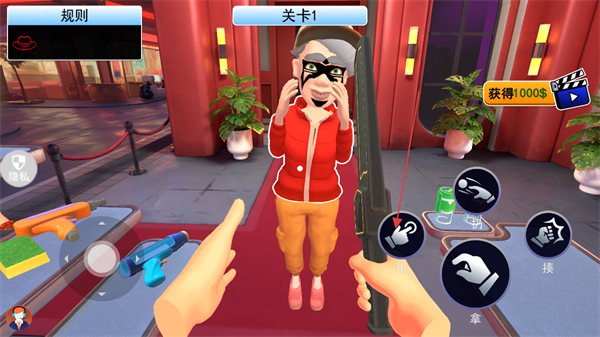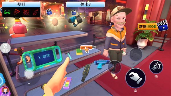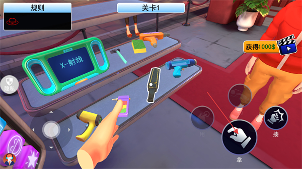 2、處于關(guān)卡1界面時(shí),將視角移向物品欄里的工具,通過點(diǎn)擊拿按鈕的操作選取工具,為后續(xù)檢查做準(zhǔn)備。