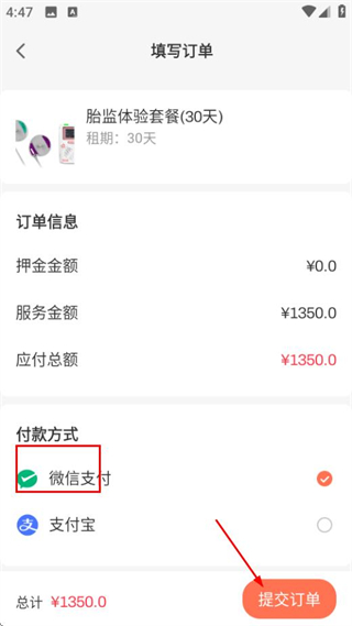 4、在填寫訂單頁面選擇微信支付后,點(diǎn)擊提交訂單按鈕完成購(gòu)買操作。