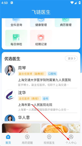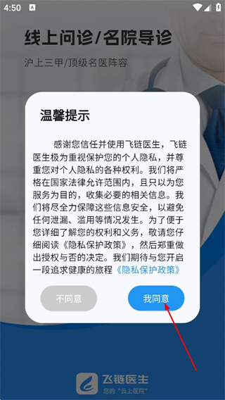 1、在飛鏈醫(yī)生的溫馨提示彈窗中,點(diǎn)擊我同意,進(jìn)入APP的首頁界面。