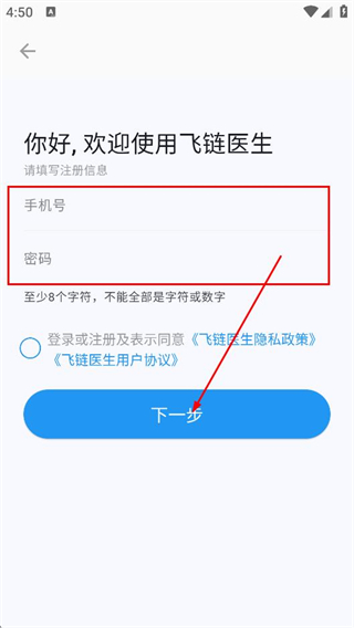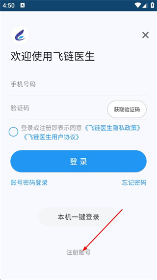 3、在界面中,點(diǎn)擊注冊賬號選項(xiàng),進(jìn)入飛鏈醫(yī)生的注冊信息填寫頁面。