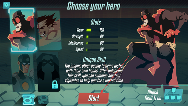 1、在英雄選擇界面選定英雄后,查看其屬性與UniqueSkill說明,點擊底部Start按鈕即可進(jìn)入游戲?qū)?yīng)的后續(xù)流程。