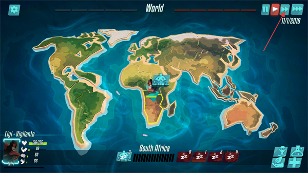 2、進(jìn)入World界面后,當(dāng)前顯示的區(qū)域為SouthAfrica,界面中的數(shù)值變化對應(yīng)區(qū)域狀態(tài),可在此界面推進(jìn)該區(qū)域的游戲相關(guān)進(jìn)程。