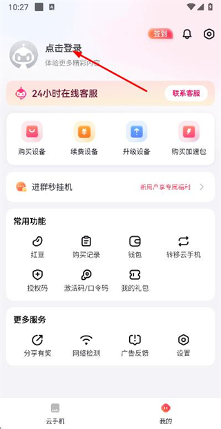 1、在云手機(jī)頁面點(diǎn)擊底部我的,進(jìn)入個人中心頁面。