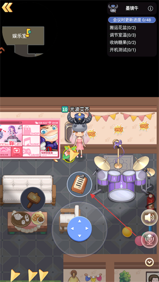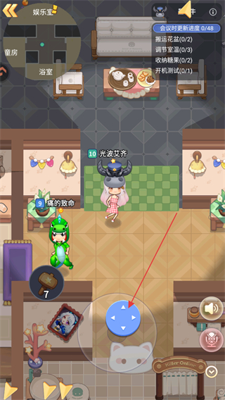 2、在娛樂室場景,操控角色移動,與其他玩家互動,準(zhǔn)備參與游戲玩法。