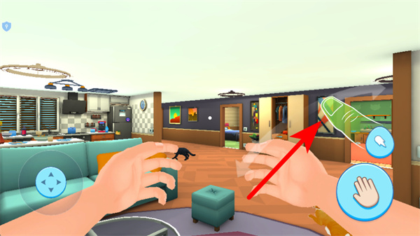 2、跟隨紅色箭頭指引,操控角色移動到沙發(fā)區(qū)域,與沙發(fā)上的道具進行交互,完成這一步操作以推進游戲的任務(wù)進度,注意觀察場景中的可交互元素。