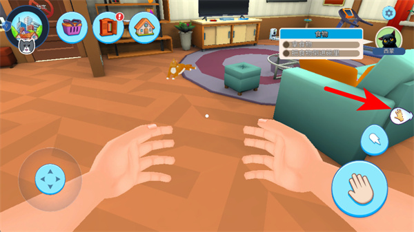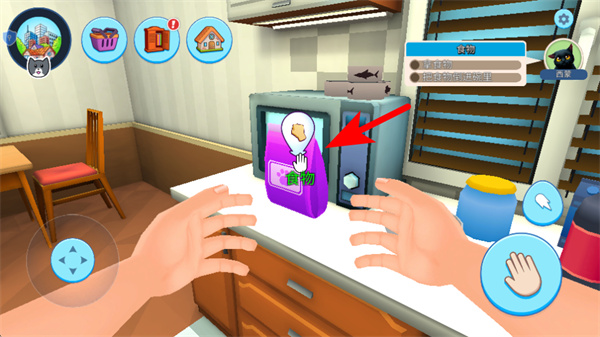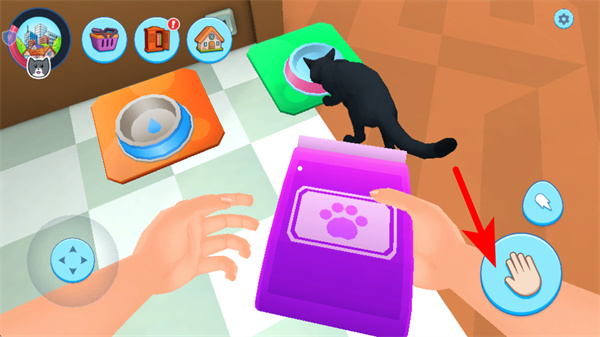 4、攜帶道具移動到貓咪所在區(qū)域后,點擊紅色箭頭指向的手掌按鈕,使用拾取的道具喂養(yǎng)貓咪,完成當(dāng)前關(guān)卡的核心任務(wù),推進游戲的劇情流程。