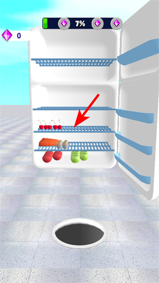 1、完成物品收集后,將黑洞移動(dòng)到紅色箭頭指向的冰箱層架區(qū)域,把吞噬的物品分類擺放到對(duì)應(yīng)層架,完成冰箱收納的整理操作。