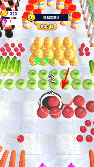 2、進(jìn)入新的收集關(guān)卡后,操控紅色箭頭指向的黑洞移動(dòng)到蘋果堆區(qū)域,吞噬蘋果類物品,同時(shí)利用變大效果提升黑洞吞噬效率。