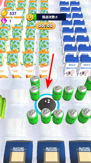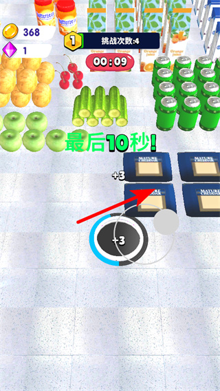 4、關(guān)卡結(jié)束前,將黑洞移動(dòng)到紅色箭頭指向的罐裝物品區(qū)域,吞噬剩余的罐裝物品,最大化完成本次收集任務(wù)。