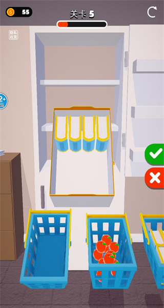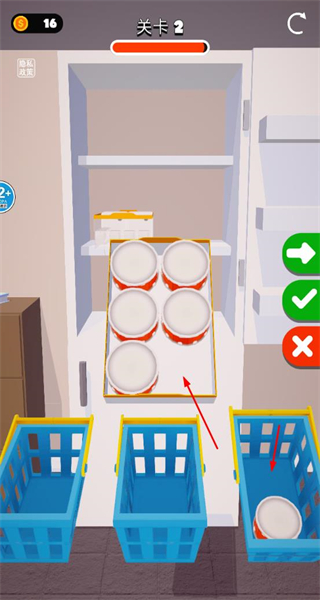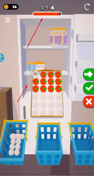 4、后續(xù)關(guān)卡中,將籃筐內(nèi)物品與冰箱內(nèi)同類物品歸置,完成整理。