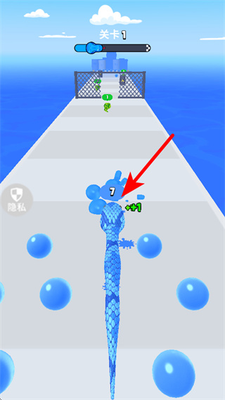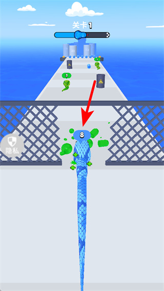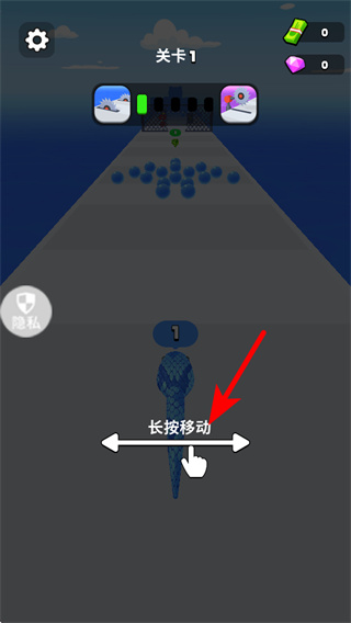 2、進(jìn)入關(guān)卡1后,按照紅色箭頭指引的長按移動提示,長按屏幕控制蛇形角色左右移動,熟悉角色的操控方式。