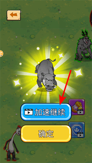 4、合成新單位后,點(diǎn)擊紅色箭頭指向的加速繼續(xù),快速推進(jìn)關(guān)卡流程,繼續(xù)參與后續(xù)的僵尸動(dòng)物對(duì)戰(zhàn),向通關(guān)目標(biāo)推進(jìn)。