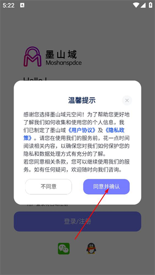 1、閱讀墨山域的溫馨提示,了解用戶協(xié)議隱私政策后點(diǎn)擊同意并確認(rèn)。