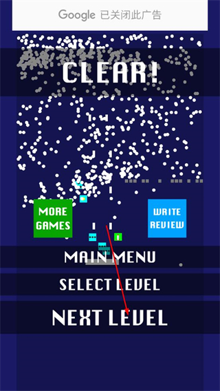 4、擊碎所有方塊后會(huì)顯示CLEAR通關(guān)提示,點(diǎn)擊NEXT LEVEL進(jìn)入下一關(guān),挑戰(zhàn)更復(fù)雜的方塊布局與彈球軌跡。