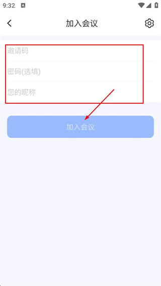 3、在加入會議頁面,填寫邀請碼、密碼、昵稱后,點擊加入會議。