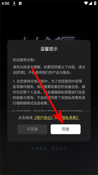 1、打開光卷,在彈出的彈窗中點擊同意,進(jìn)入應(yīng)用首頁。