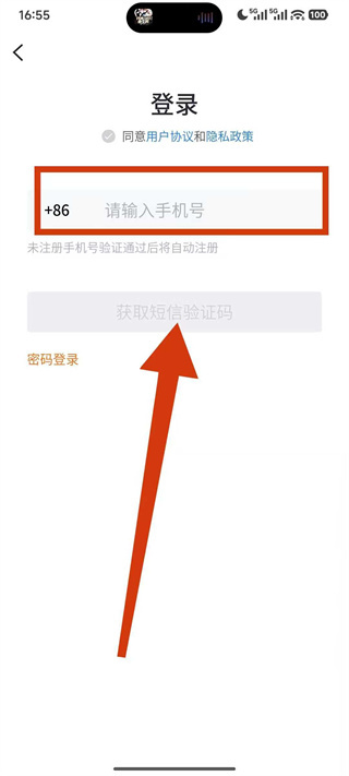 4、在登錄頁面的手機號欄填寫手機號碼,點擊獲取短信驗證碼。