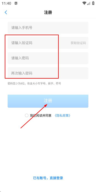 3、在注冊(cè)賬號(hào)頁面填寫驗(yàn)證碼和密碼,勾選協(xié)議后點(diǎn)擊注冊(cè)完成注冊(cè)操作。