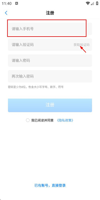 2、在注冊(cè)賬號(hào)頁面填寫手機(jī)號(hào)碼后,點(diǎn)擊獲取驗(yàn)證碼。