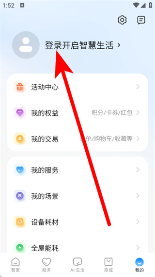 2、在個(gè)人頁(yè)面,點(diǎn)擊登錄開啟智慧生活,進(jìn)入登錄頁(yè)面。