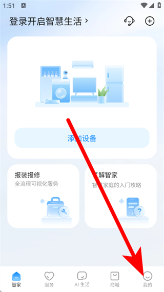 1、打開海爾智家,點(diǎn)擊底部我的,切換至個(gè)人頁(yè)面。