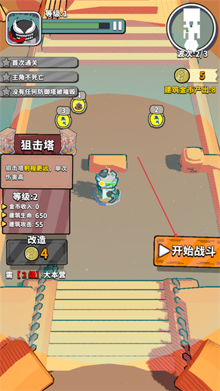 1、查看狙擊塔屬性,消耗資源選擇改造,點(diǎn)擊開始戰(zhàn)斗進(jìn)入關(guān)卡,準(zhǔn)備迎敵。
